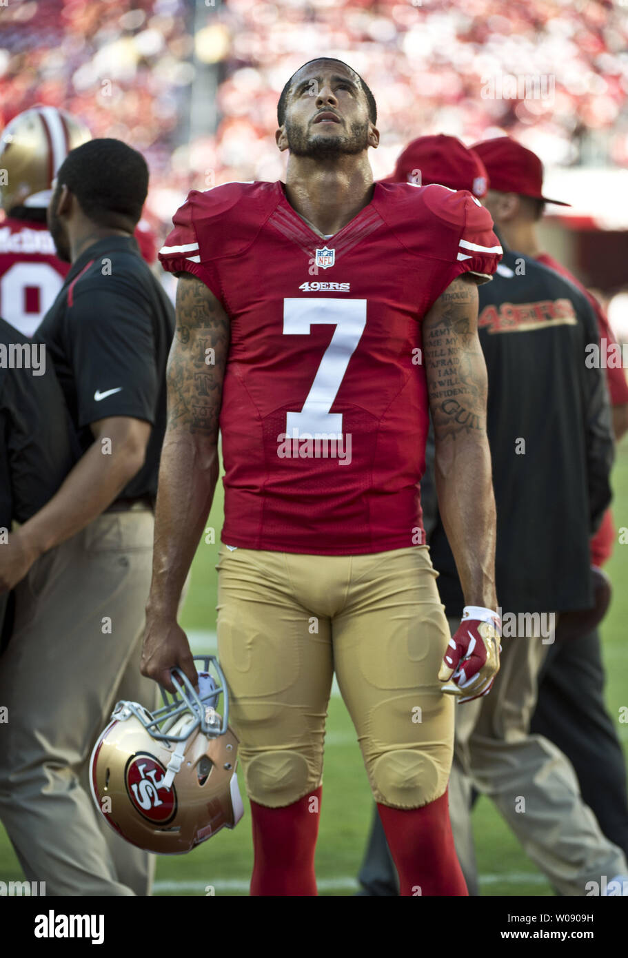 San Francisco 49ers QB Colin Kaepernick looks up after warmups to